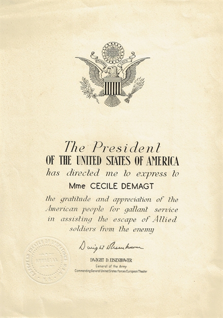 Diplôme anglais pour l'aide fournie aux militaires britanniques Jim BLORE et John Robert NORGAN. Diplômes américains pour l'hébergement de trois aviateurs américains : S/Sgt James A KING - S/Sgt Walter J. SENTKOWSKI - 2/Lt Joseph Allen BIRDWELL. Et une aide matérielle aux 2/Lt William F MIDDELDORF et 2/Lt Francis Wavier HARKINS