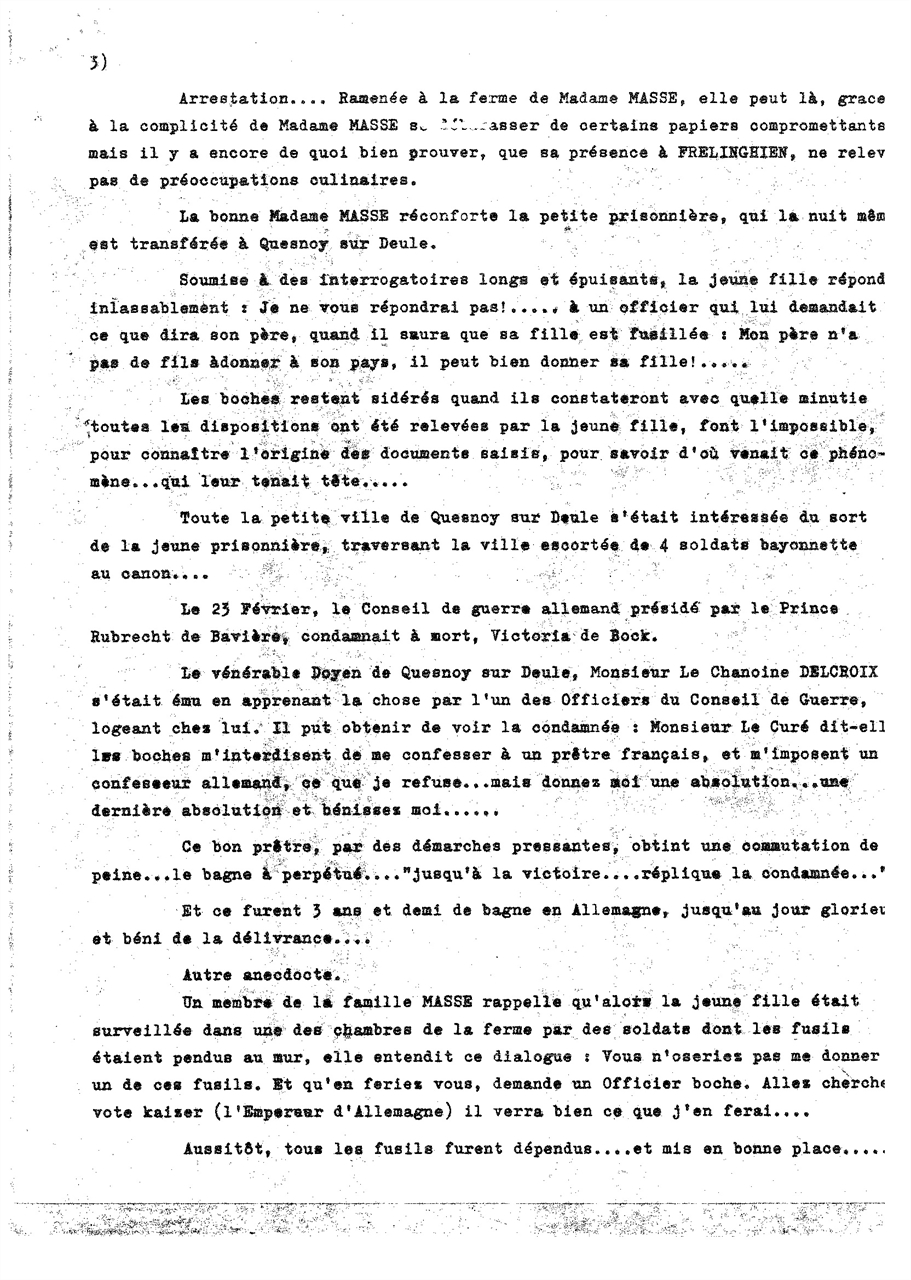 .......Plus de canonnade. Hier, une jeune fille d'une vingtaine d'années a été conduite au poste, on la soupçonne d'espionnage (Angèle Victoria De Bock passe la nuit au corps de garde des hussards, dans le café du Mouton Blanc à Quesnoy sur Deûle, tenu par Mr Cocherel). Elle comprend parfaitement l'allemand, parle anglais et flamand. Ses parents habitent Londres, elle est en Belgique depuis plusieurs années. Elle est conduite à la division. Le général a en possession des lettres d'Anglais et de Français qui ont été prises à la prisonnière. Cette jeune fille a répondu aux questions qui lui ont été posées avec un aplomb incroyable. Elle ne parait nullement soucieuse du sort qui l'attend. (Elle comparait devant le tribunal militaire du Kromprinz Rupprecht de Bavière) Elle sera probablement fusillée et se trouve heureuse de mourir pour son roi. (Fait également relaté dans le journal "Le Quesnoysien - résistante belge en fin de page - Monsieur Masse de Frelinghien l'aide, mais elle est arrêtée près de sa ferme).